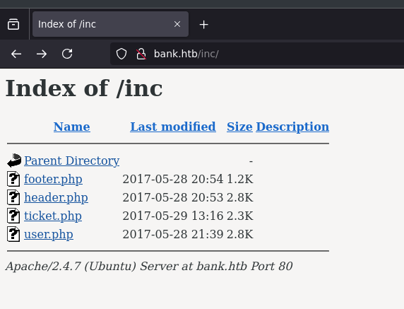 The subdomain chris.bank.htb seems like a rabbit hole, there is nothing we can do on here. However it gives the information that there is a configuration file for that subdomain and that if we can read it later, we might have new informations.